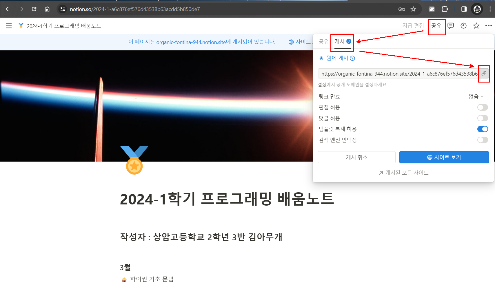 노션을 페이지를 웹에 게시하여 링크를 복사한다.