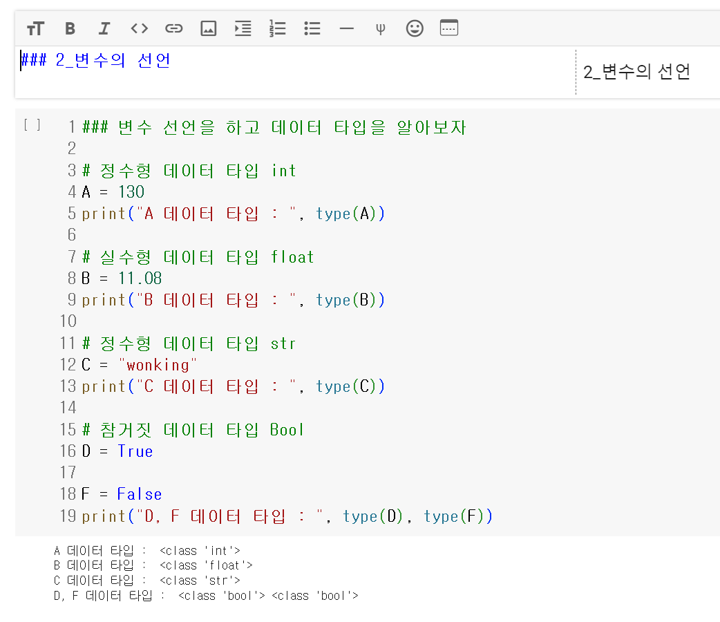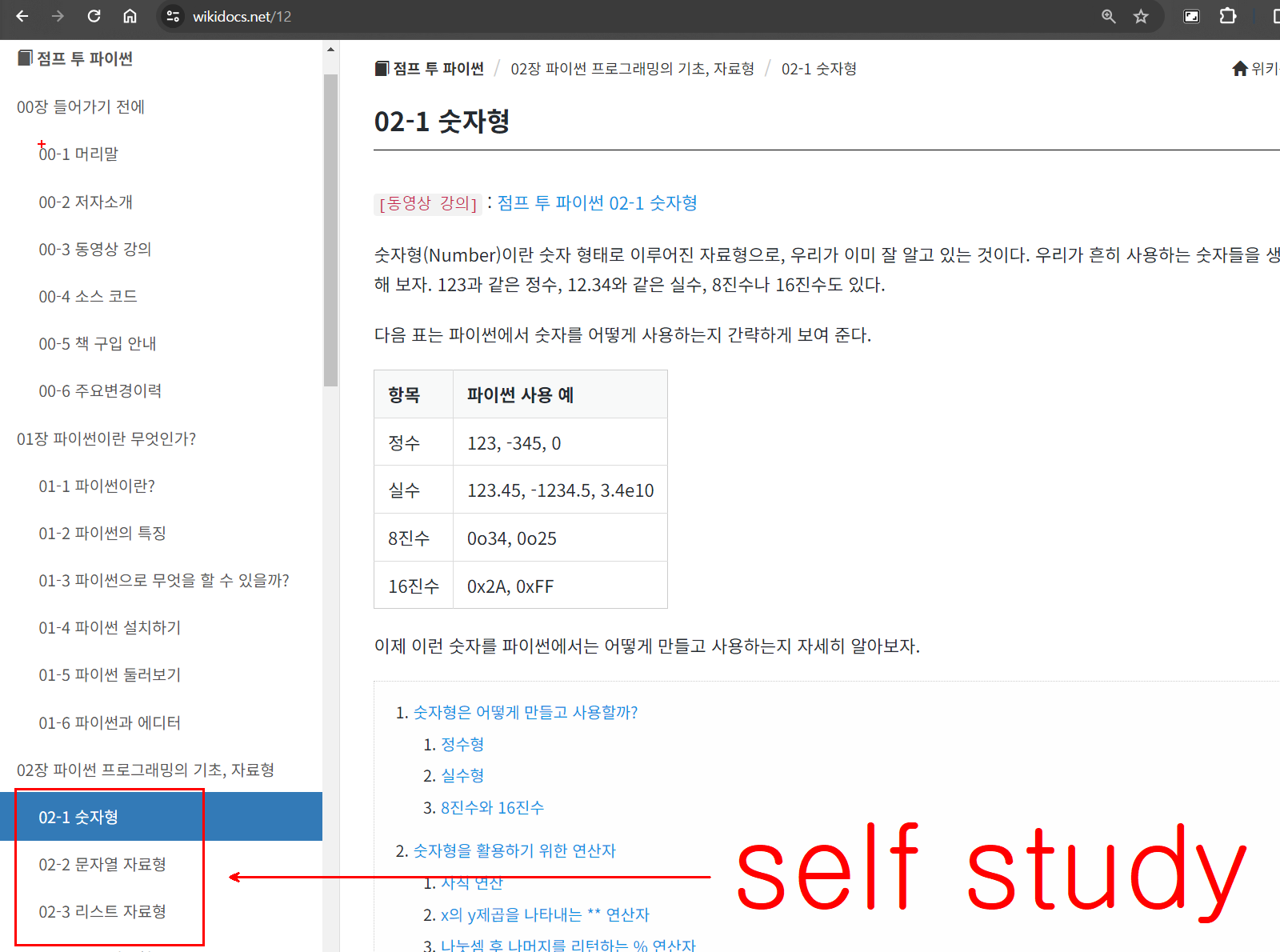 아래 링크에서 02-1 숫자형, 02-2 문자열 자료형, 02-3 리스트 자료형을 보며 스스로 공부해 보자. 새롭게 알게된 내용은 직접 코랩에서 코드를 동작시켜 보거나 노션에 정리하여 기록해 두자.