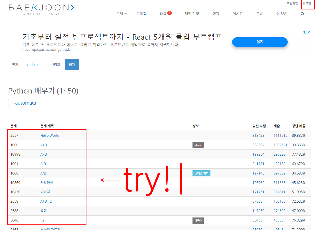 아래 링크에서 구글계정으로 로그인 한뒤 위 빨간 박스 문제들을 풀어보자.