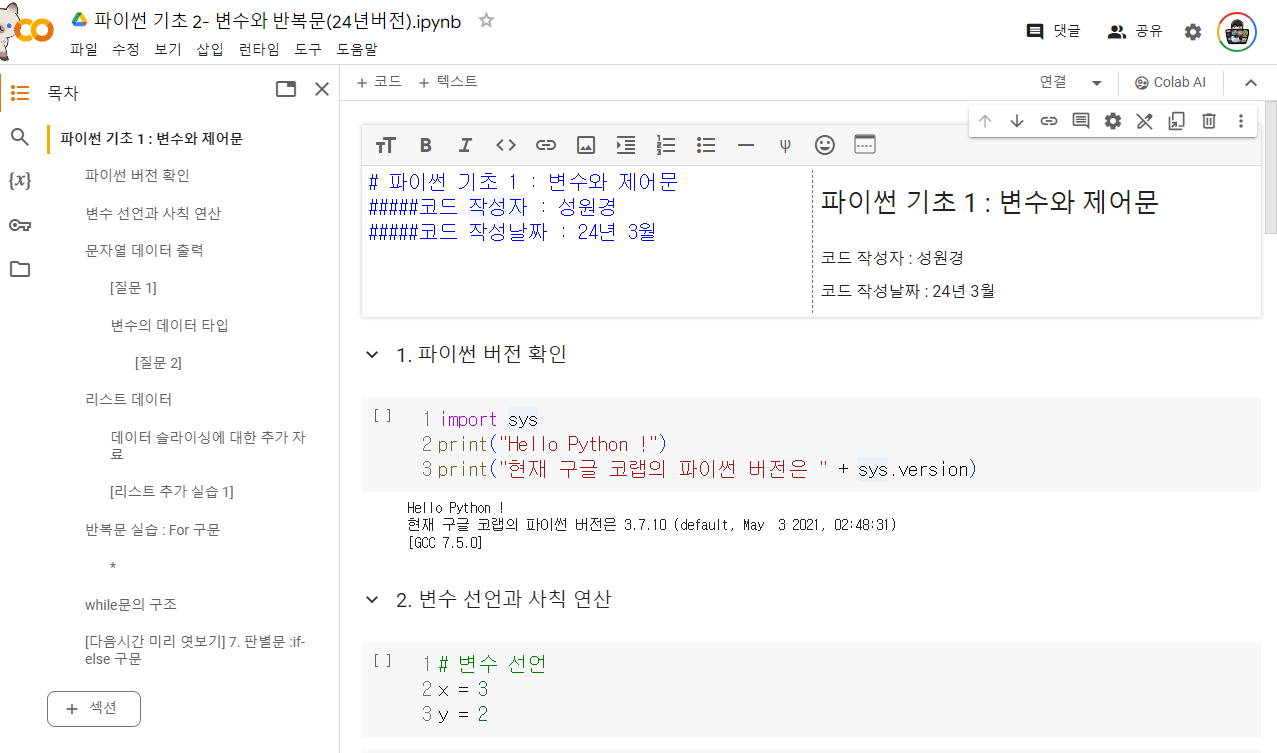 2강. 변수과 리스트 선언 한번 더 복습해 보자.