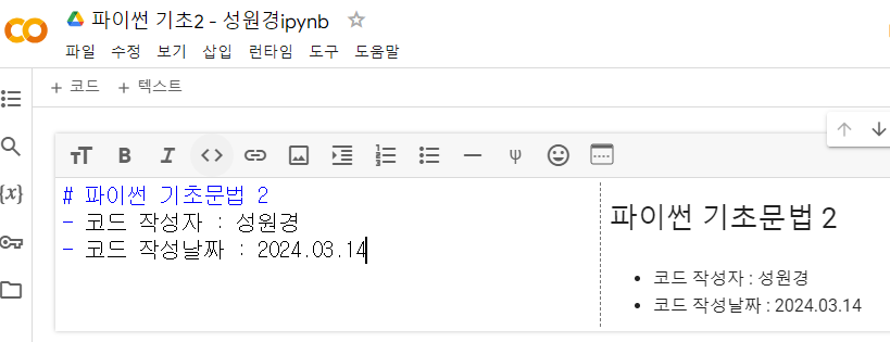 1. 코랩을 새로 열고 제목과 텍스트 추가.