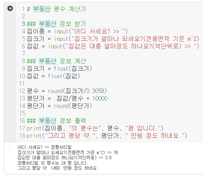 2. 오늘도 일단 따라서 타이핑 해보자. input 함수를 돌릴때는 직접 데이터를 넣고 엔터를 쳐보자.
