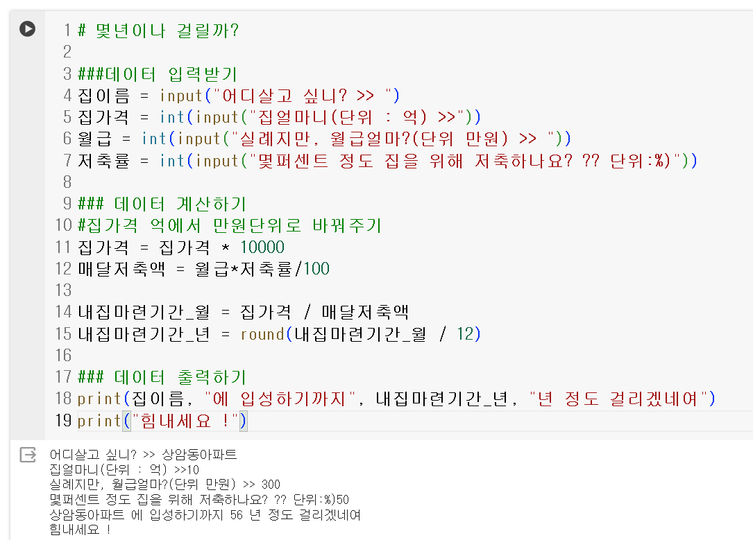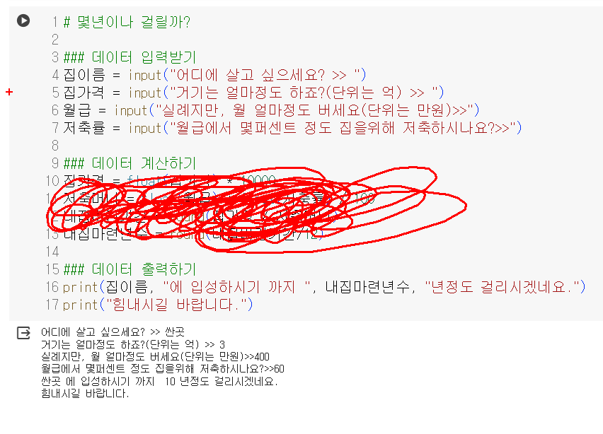 * 아래 코드를 참고하여 내집마련까지 걸리는 시간을 계산해주는 코드를 만들어 보자.