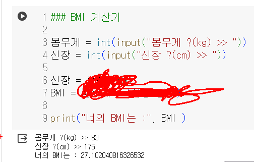 BMI 계산 후에 BMI가 18.5보다 작으면 저체중