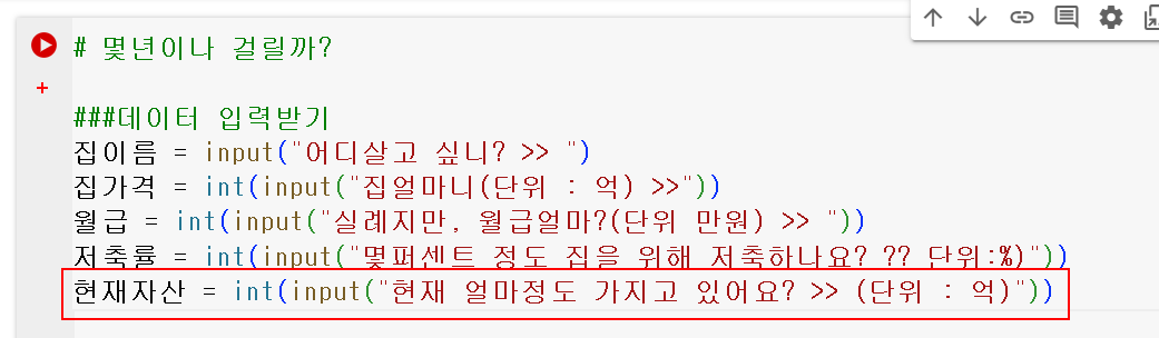 * 아래 코드를 참고하여 내집마련까지 걸리는 시간을 계산해주는 코드를 만들어 보자.