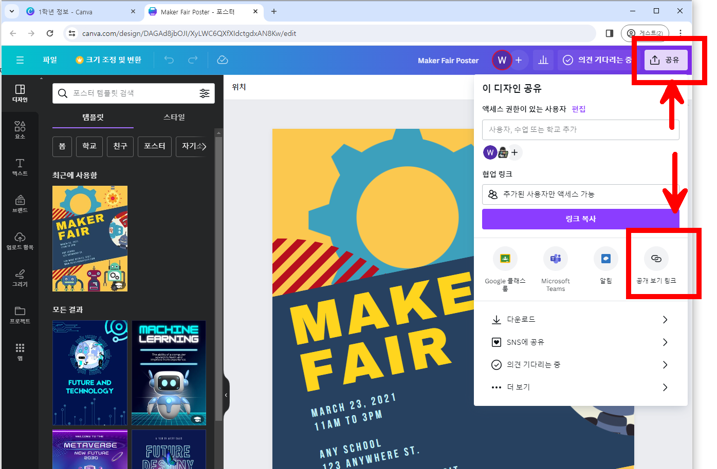 캔바 무료버전 회원가입한 상태에서 아래 링크로 들어 옵니다. 아래 링크 암호는 원킹쌤이 수업에서 알려줍니다.