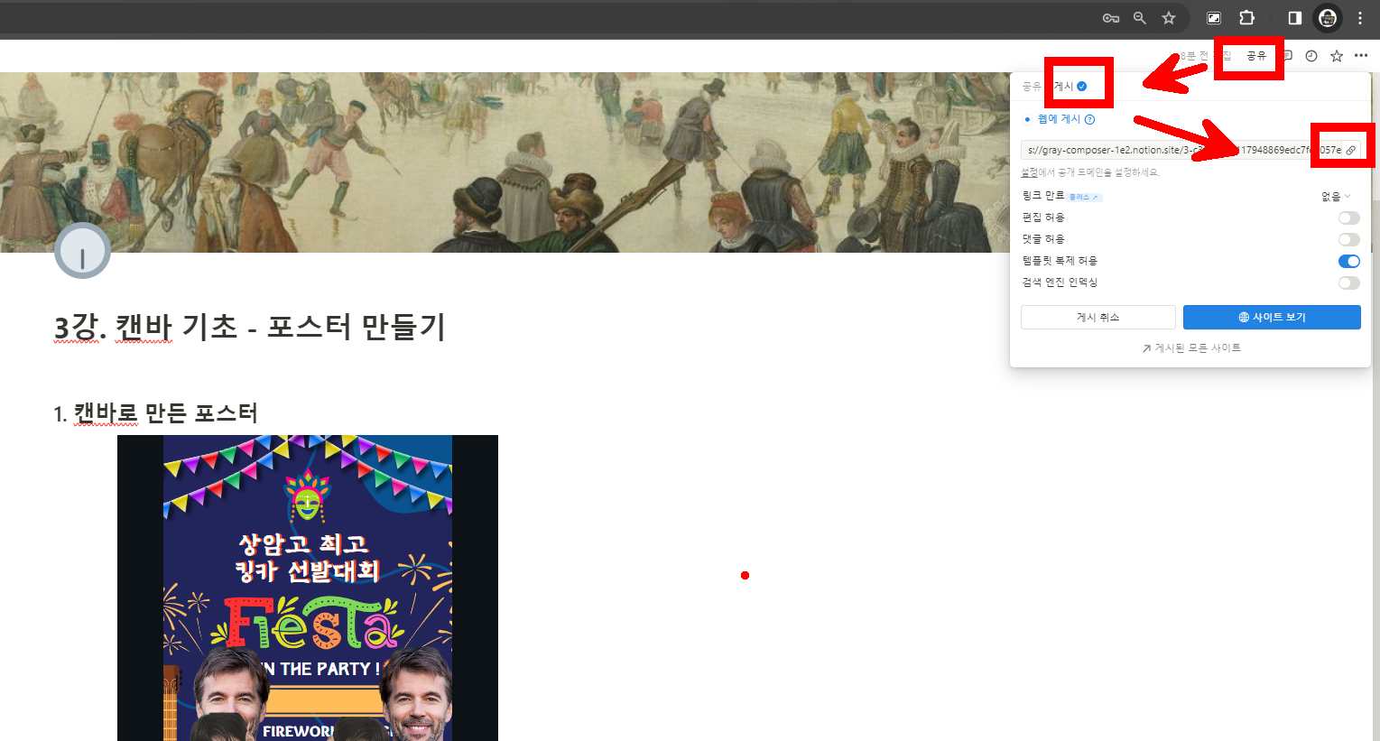 디자인 등록을 다 했으면 노션 노트 공유 - 게시 - 링크복사 하여서