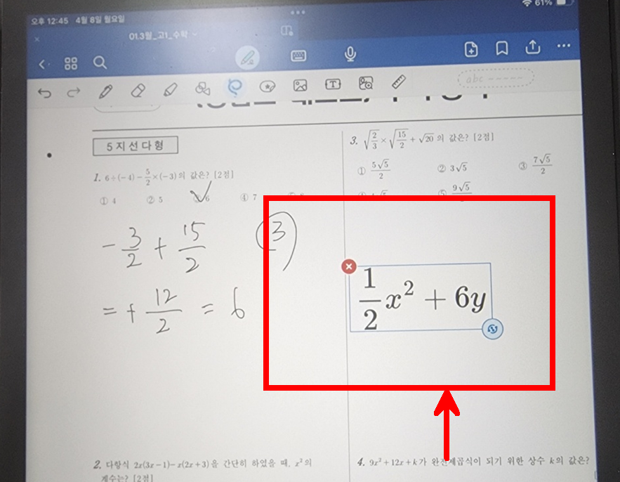 참고로 수식을 쓰고 올가미로 영역표시 후 길게 누르면 수식으로 아래와 같이 변환된다.