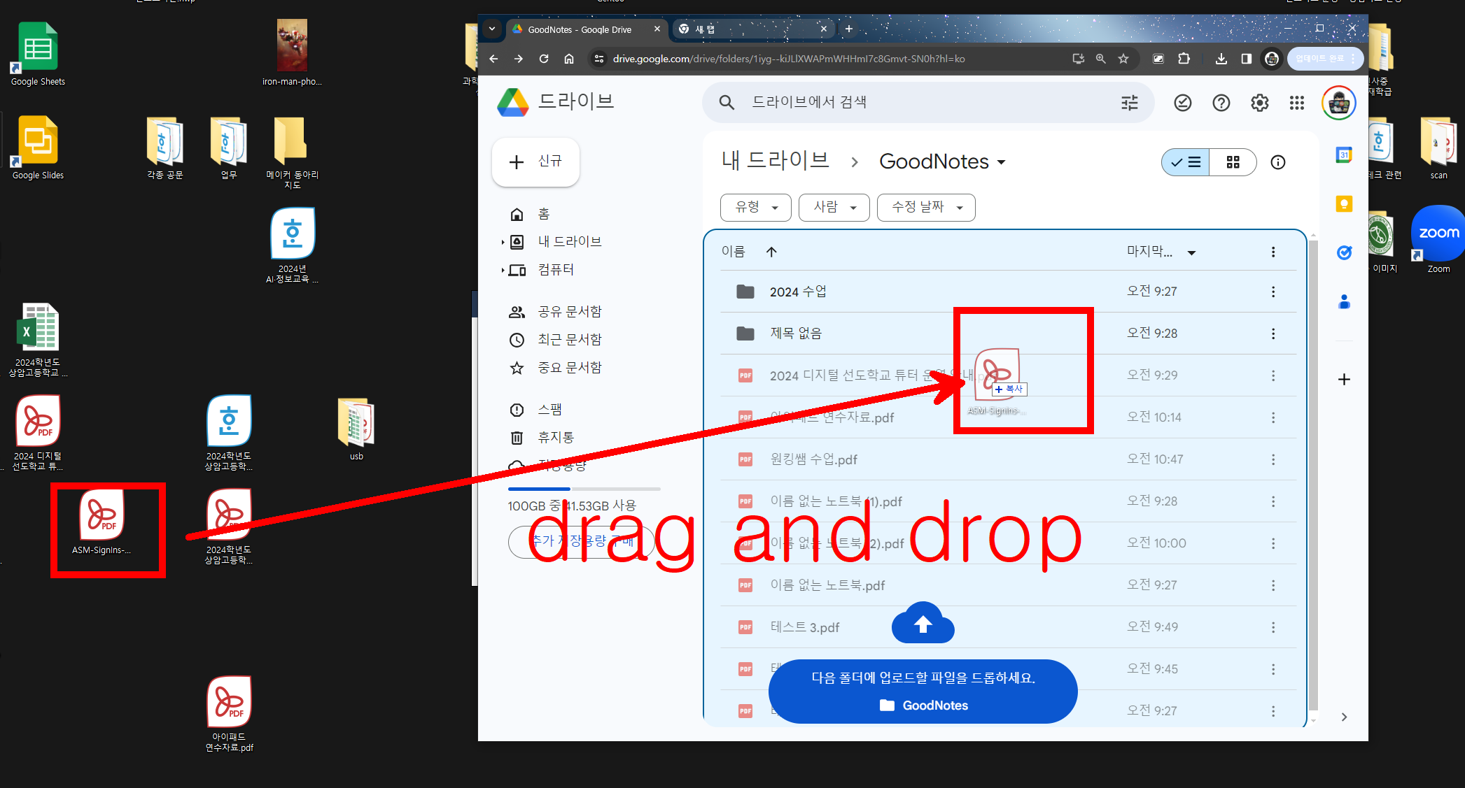구글 로그인을 하고 드래그 앤 드랍으로 파일을 이동시킨다.