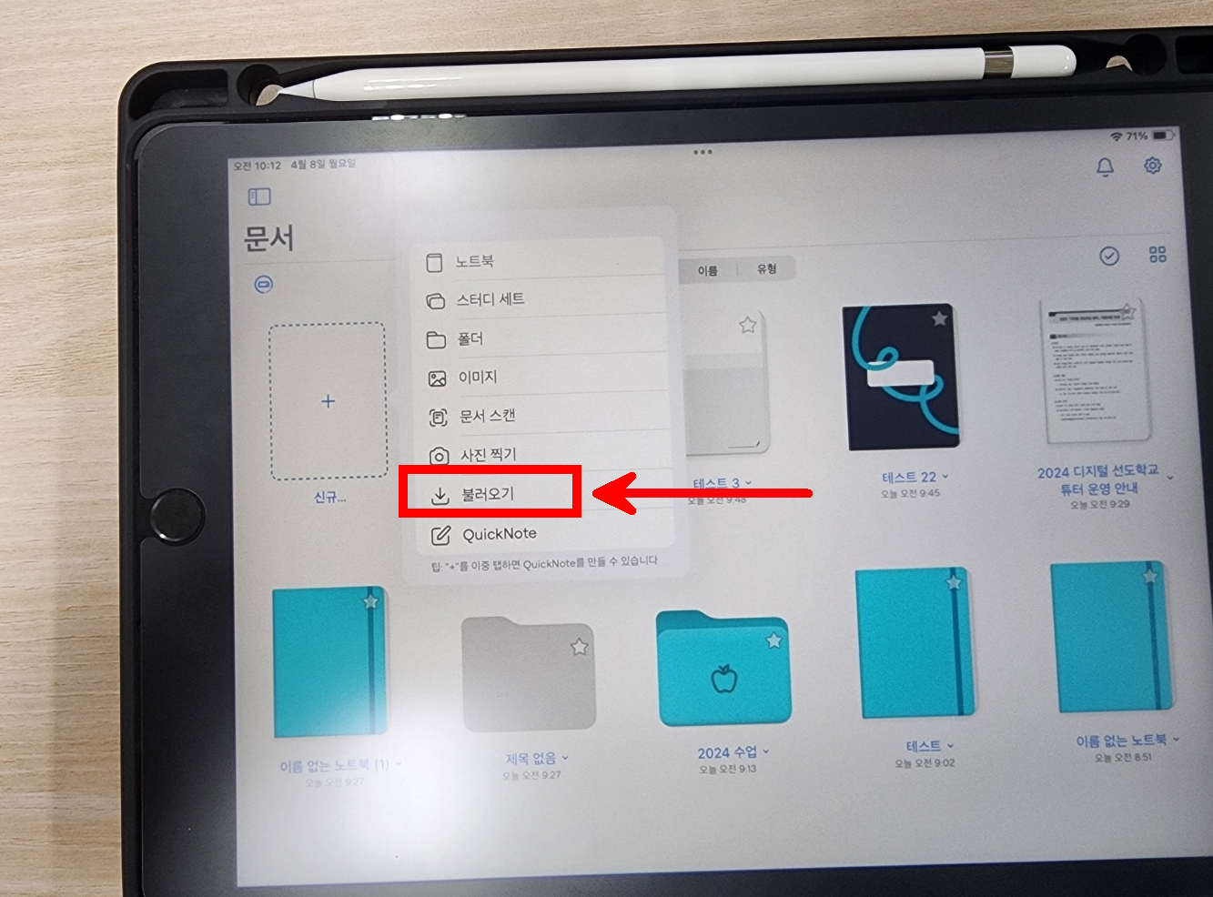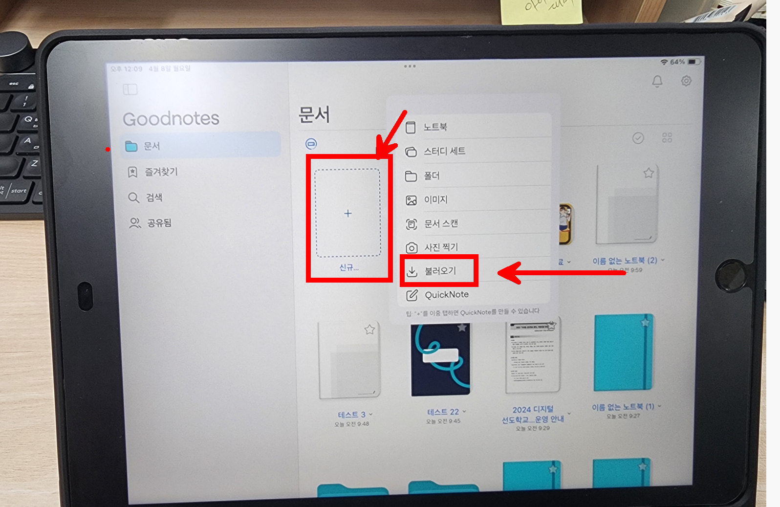 아이패드 굿노트에서 신규 - 불러오기를 누른다.