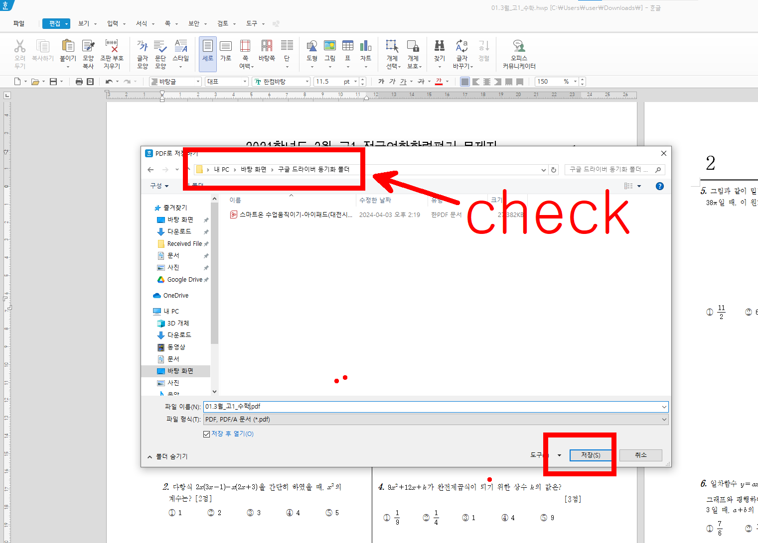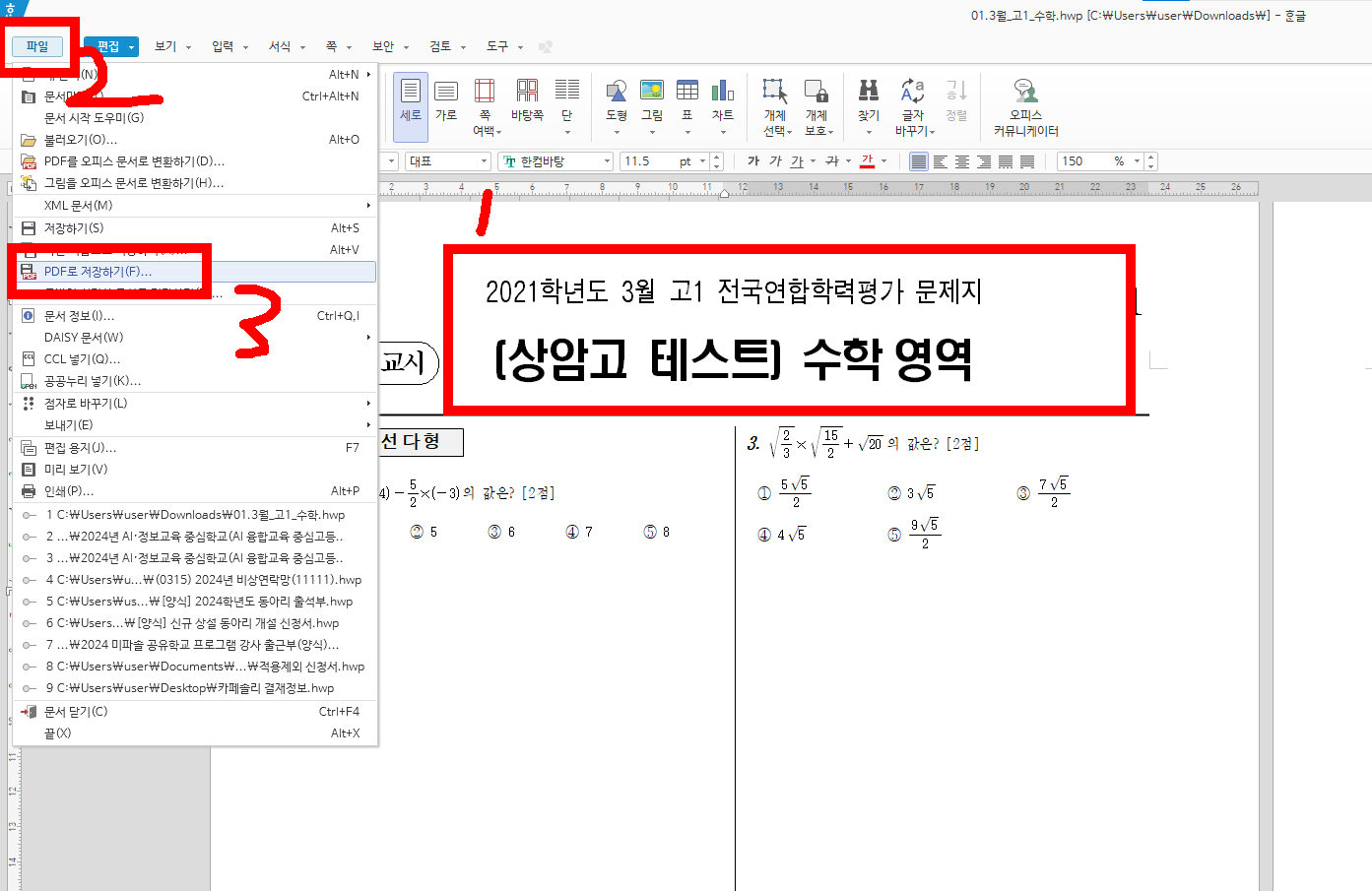 한글 파일을 열고 적당히 수전 후 pdf로 저장해 보자.