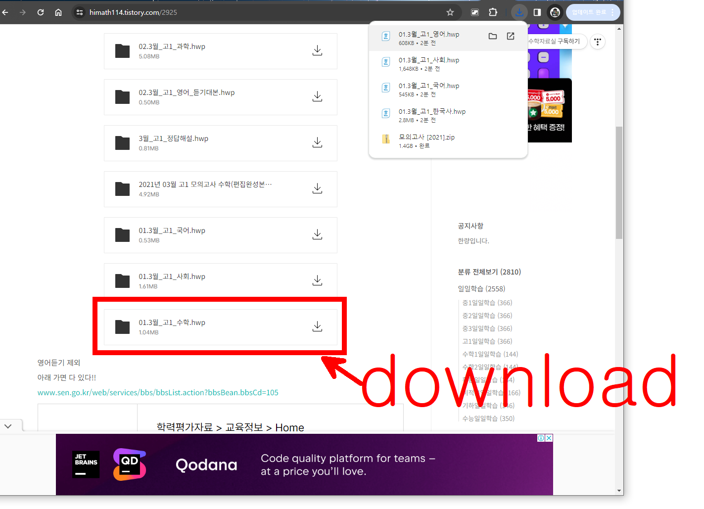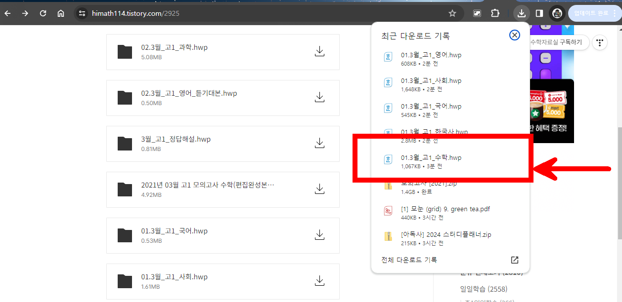 우선 윈도우 PC에서 아래 사이트에 접속해서 수학 모의고사 한글파일을 다운로드 받아보자.