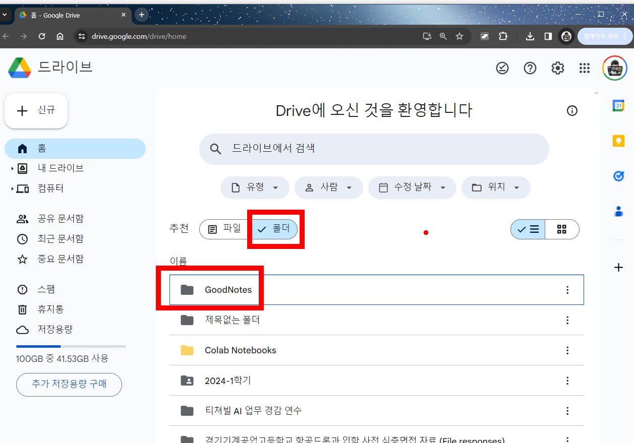 다시 pc의 구글드라이버로 가보자. 동기화된 굿노트 폴더가 만들어져 있을 것이다.
