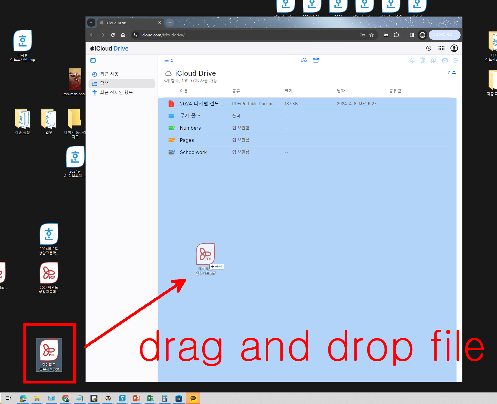 pc에서 위 pdf를 받고, 아이클라우드 창에 파일을 끌어서 자료를 업로드 해본다.