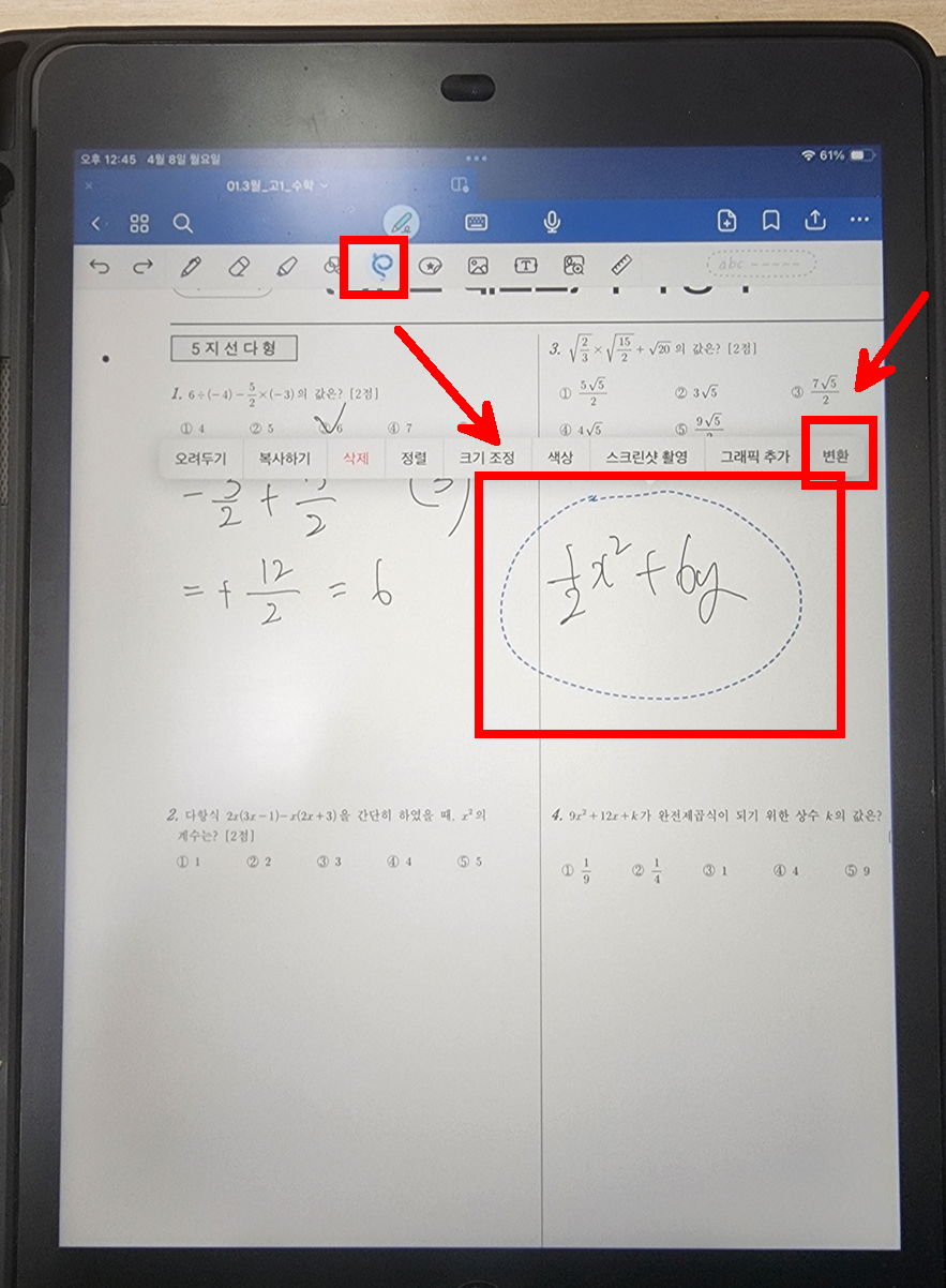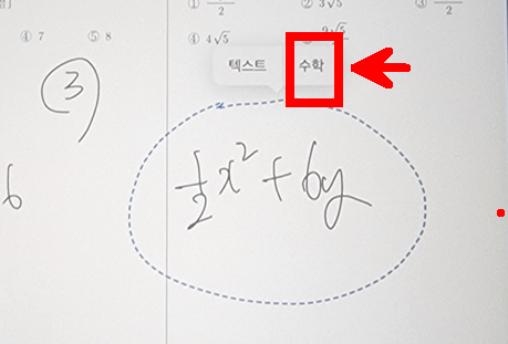 참고로 수식을 쓰고 올가미로 영역표시 후 길게 누르면 수식으로 아래와 같이 변환된다.