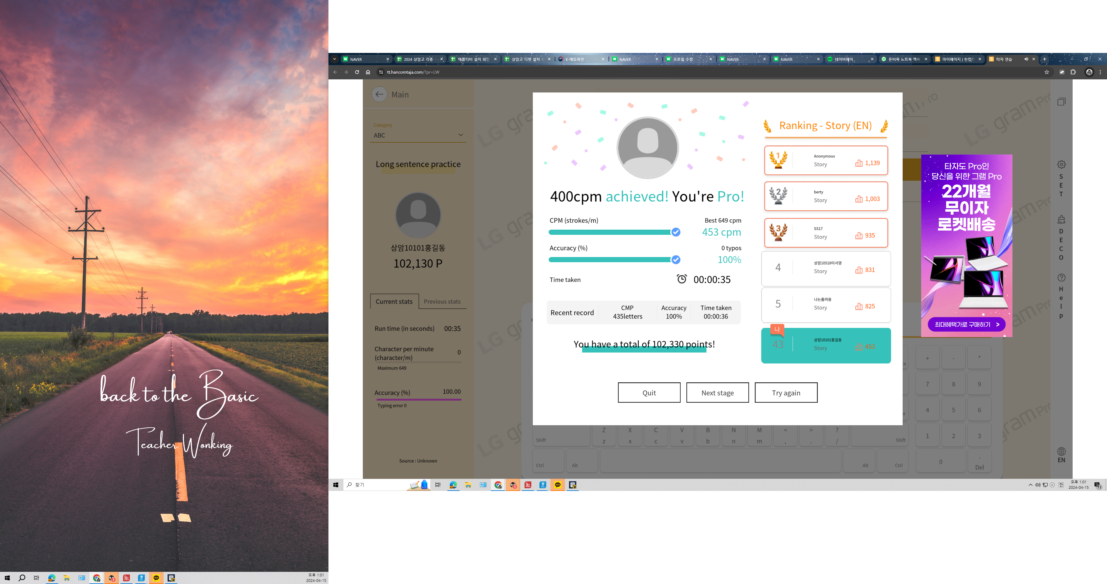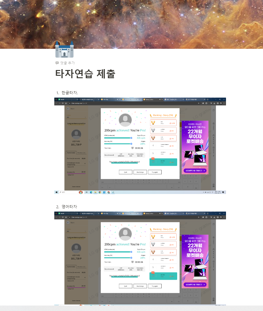 반드시 평균타수(cpm)과 정확도(Accracy), 하단의 윈도우 현재시간이 모두 포함되어야 한다.