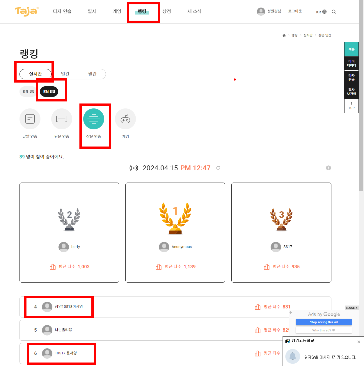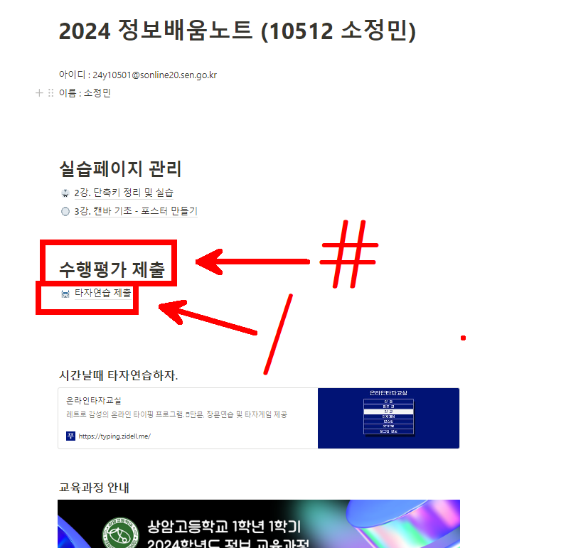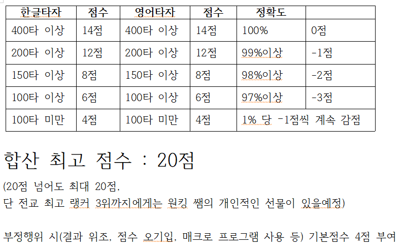 정보 수행평가 타자연습 결과 제출(2024학년도 1학년 1학기)