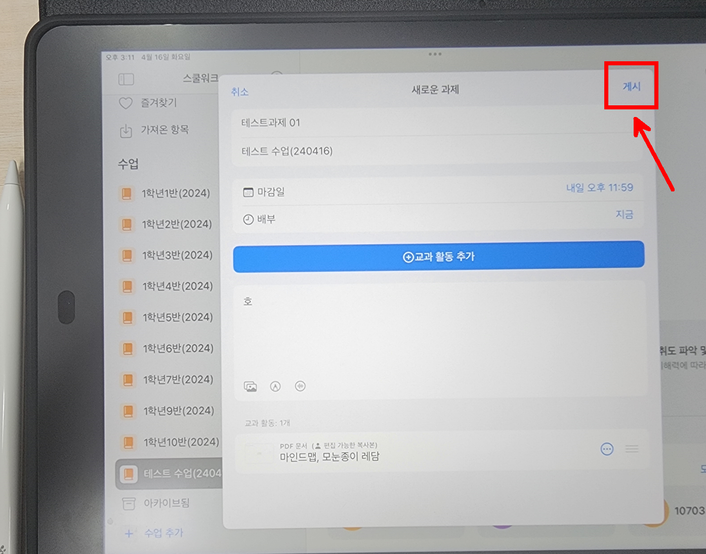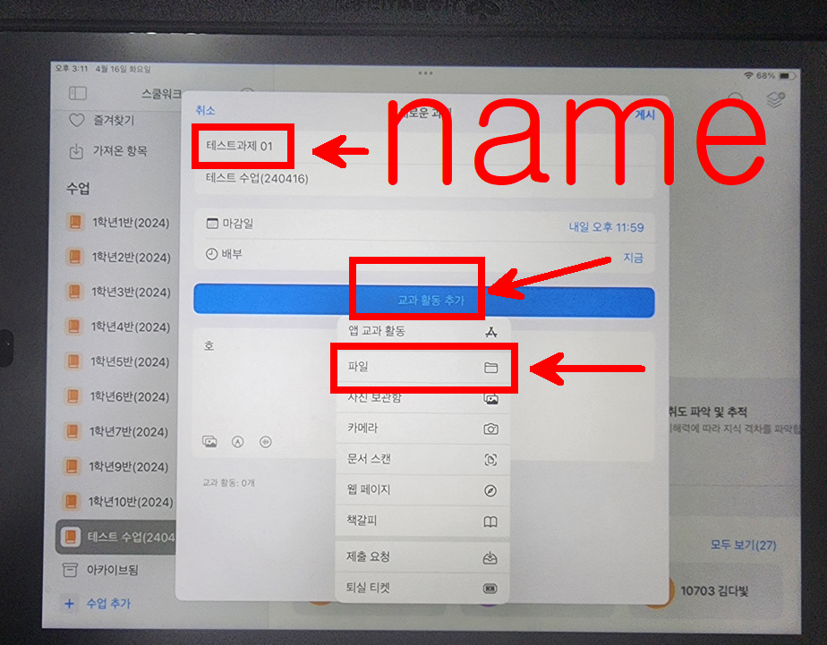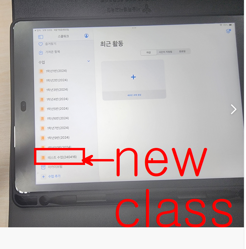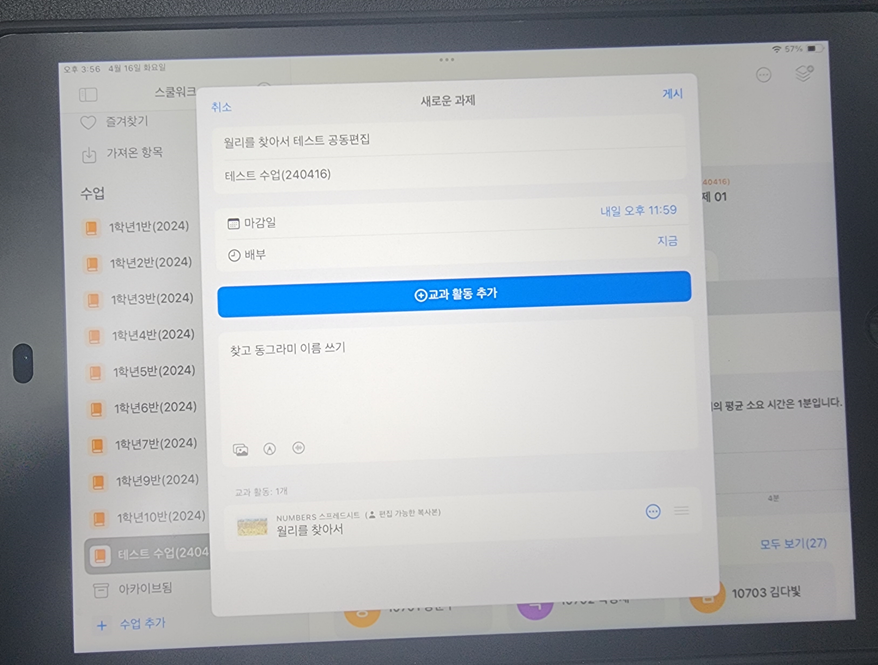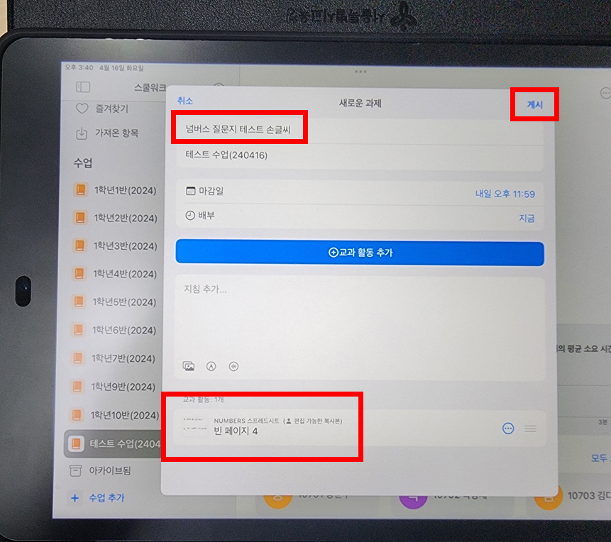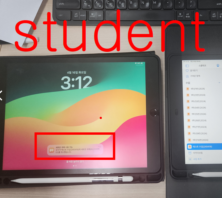 과제를 올리면 학생용 아이패드에 알람이 뜬다.