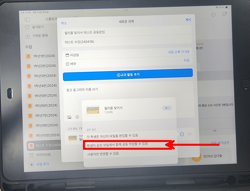 과제 설정을 [학생이 같은 파일에서 함께 공동 작업할 수 있음]으로 변경한다.