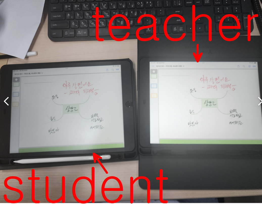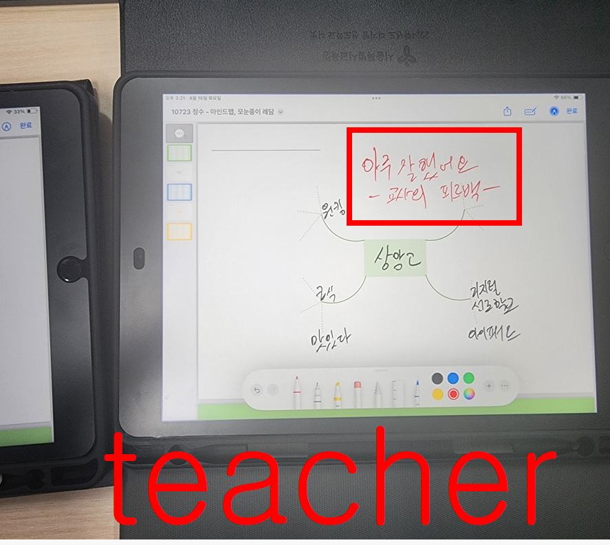교사 아이패드에서는 현재 누가 어떻게 수정하고 있고, 몇분동안 하고 있는지 실시간으로 모니터링 된다.