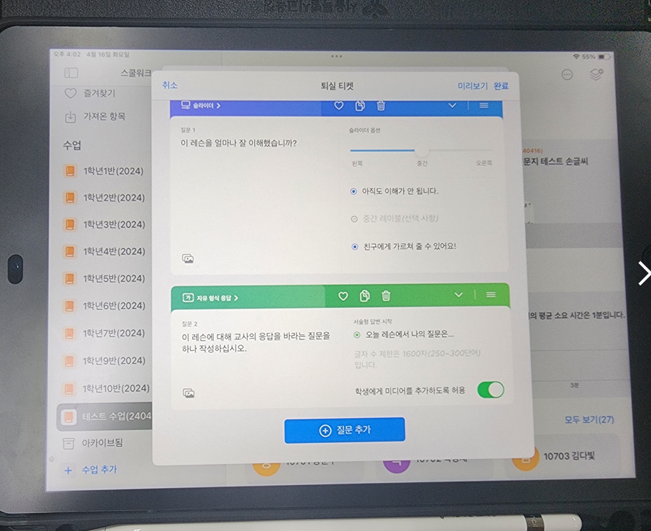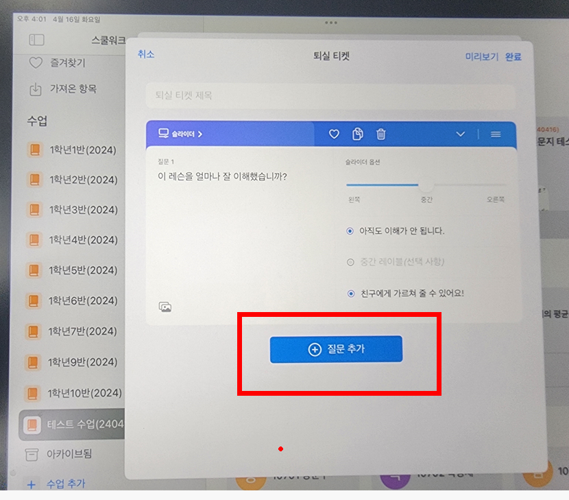 질문지를 적고 [완료] 버늩을 누르고 나오자.