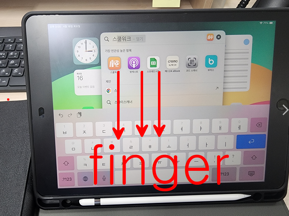 자 오늘도 새로운 앱을 시작하기 위해 손가락 3개를 아이패드에 내려 앱검색을 활성화 하여 [스클워크] 를 검색해 보자.