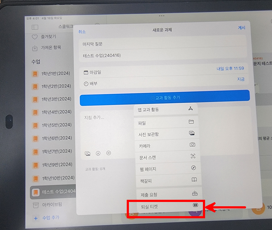과제 생성에서 퇴실티켓을 선택한다.