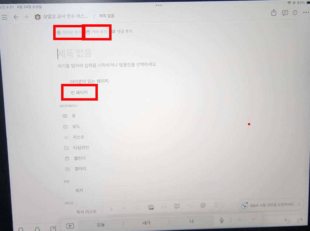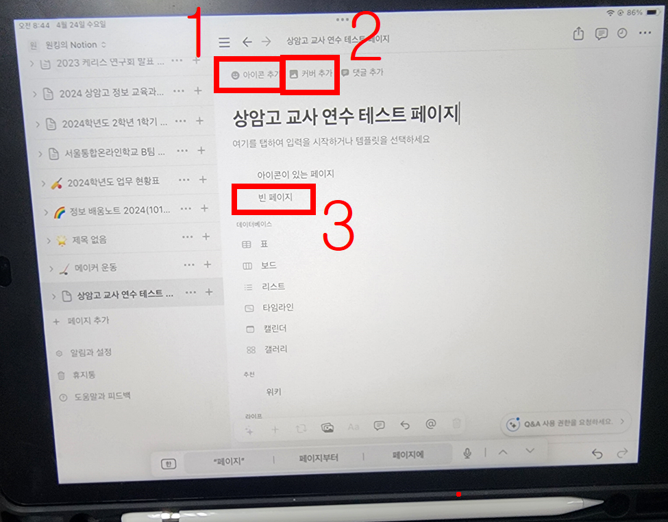 새 페이지를 만들면 기본적으로 [아이콘 추가], [커버추가], [빈페이지]를 눌러주는게 좋다.