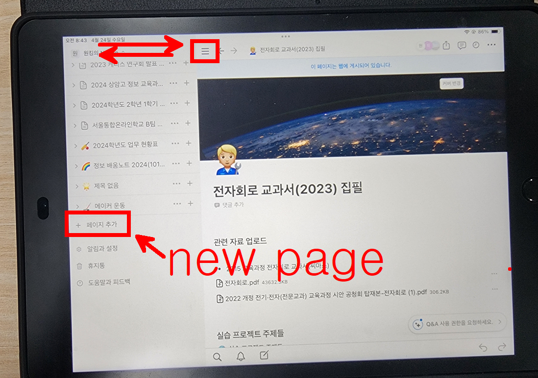 아이패드에서 노션 앱을 실행 후 로그인을 한 뒤 새 페이지를 만들어 보자.