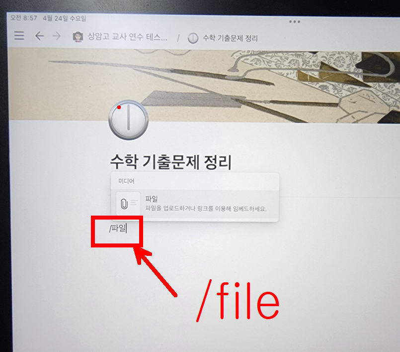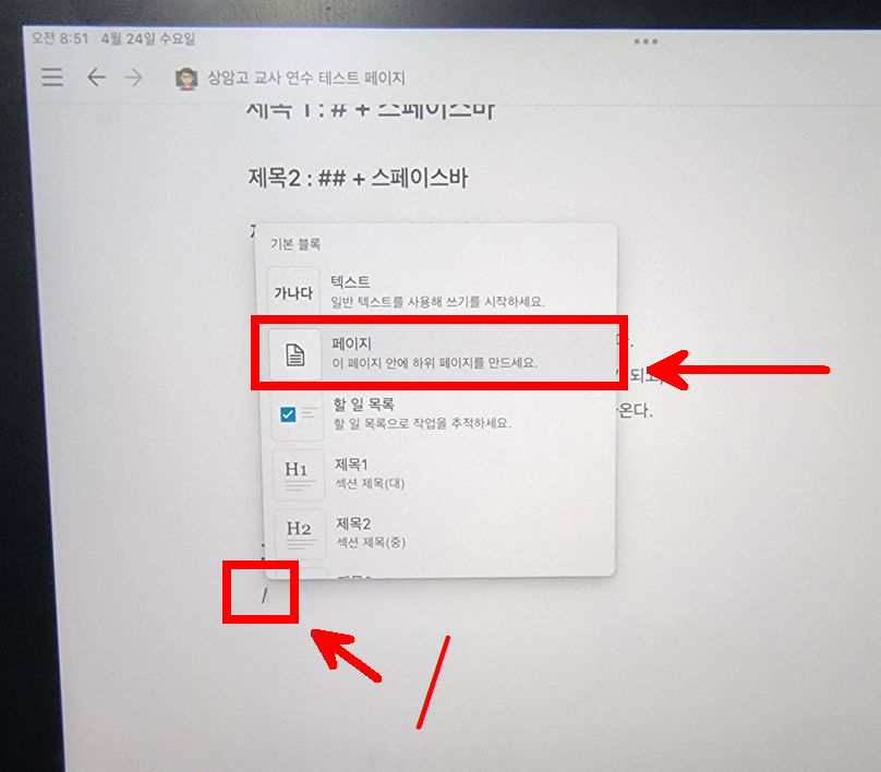 / 를 누르면 다양한 옵션이 뜬다. 그 중에 페이지 를 눌러보자.