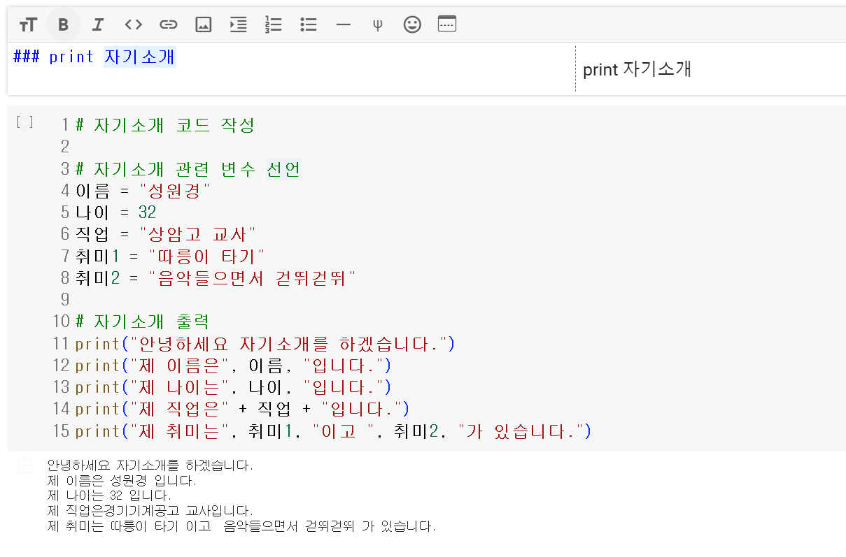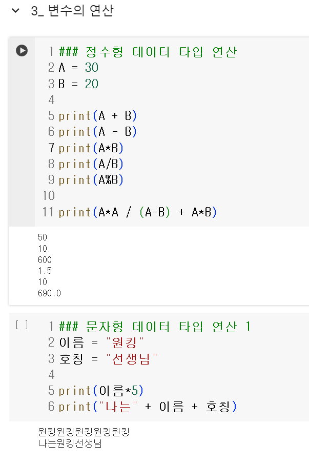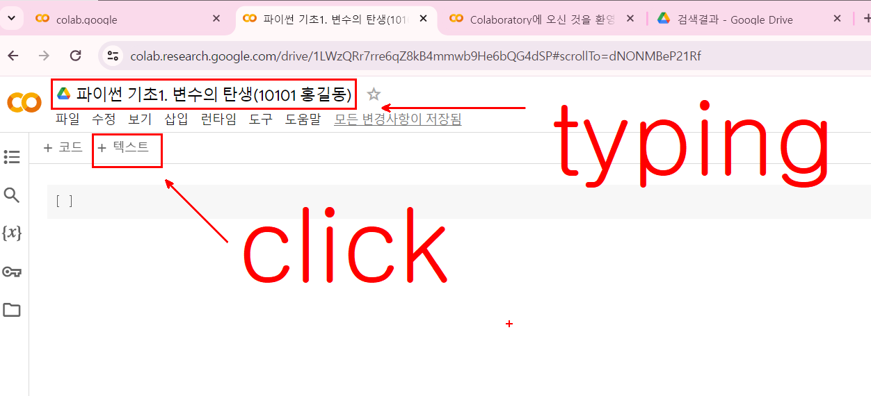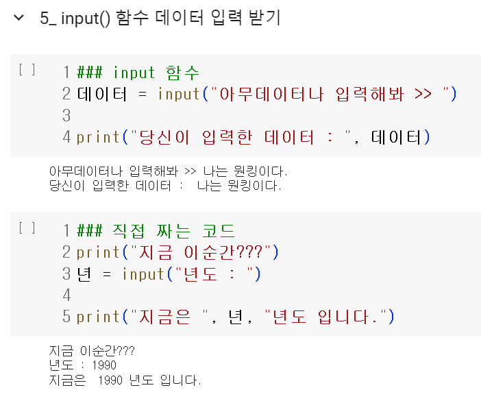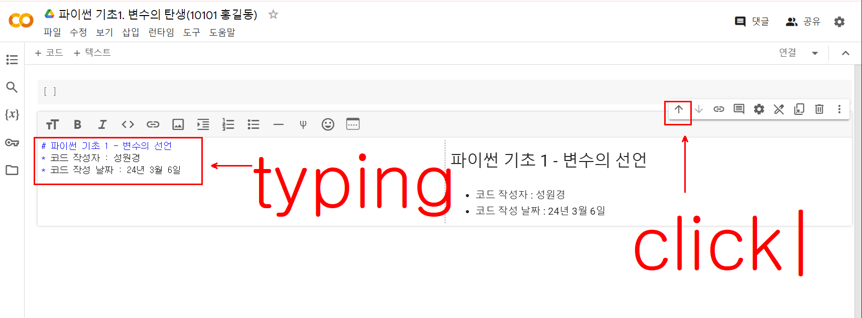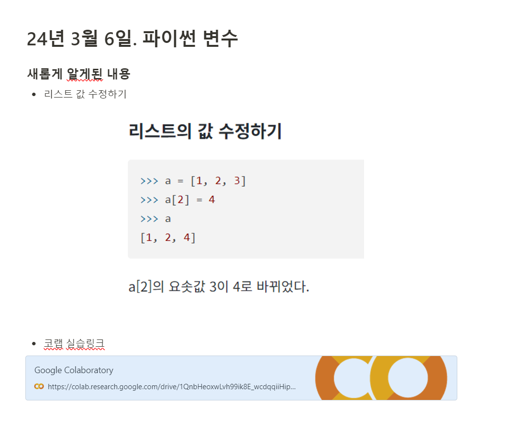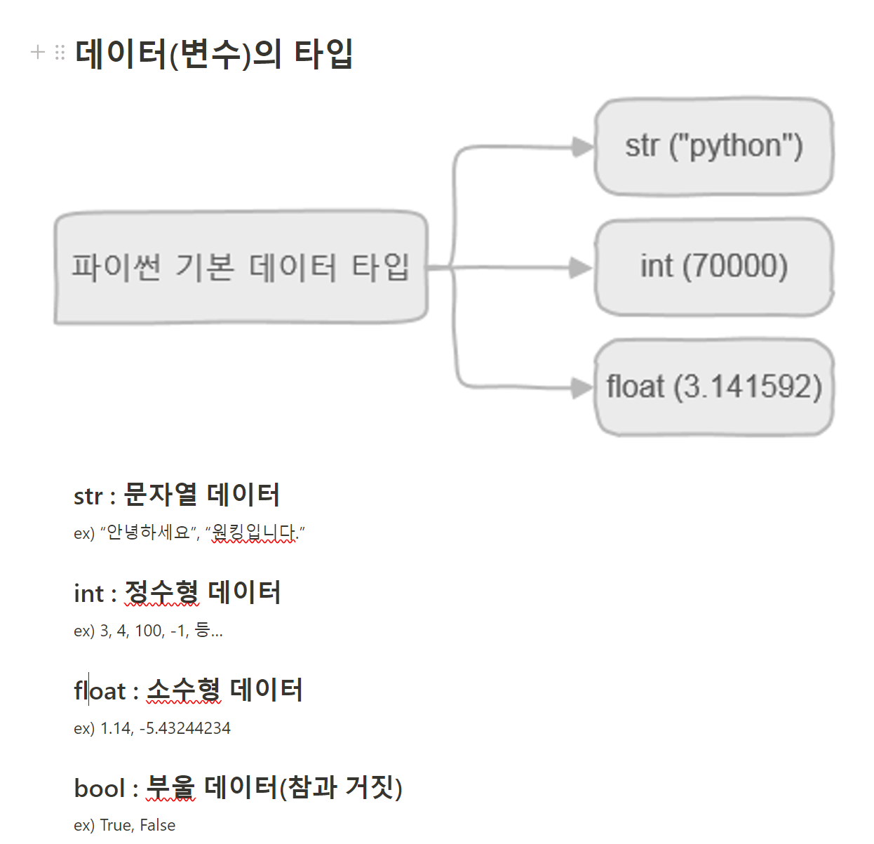 아래 링크에서 02-1 숫자형, 02-2 문자열 자료형, 02-3 리스트 자료형을 보며 스스로 공부해 보자. 새롭게 알게된 내용은 직접 코랩에서 코드를 동작시켜 보거나 노션에 정리하여 기록해 두자.