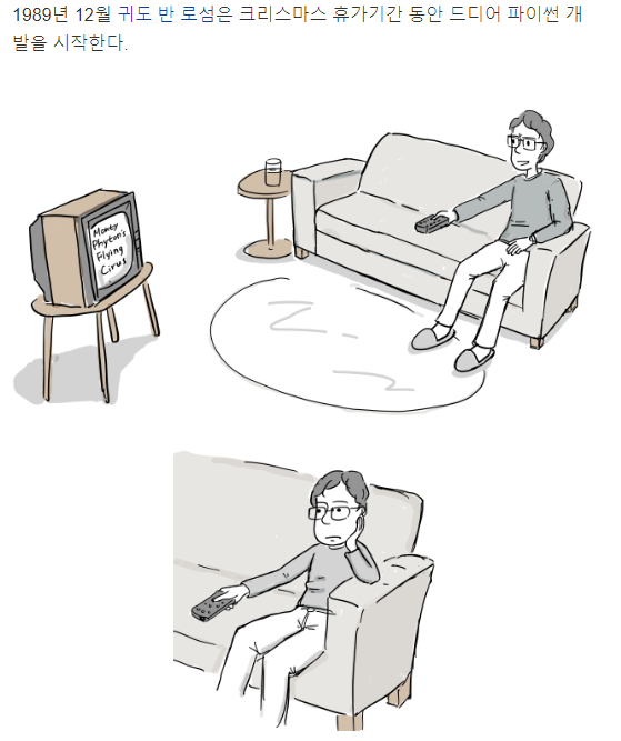 1편에서 이어집니다. 1989년 12월 귀도 반 로섬은 크리스마스 휴가기간 동안 드디어 파이썬 개발을 시작한다. “드라마가 끝났네. 크리스마스라고 딱히 할 일도 없으니, 그동안 생각해 왔던 새로