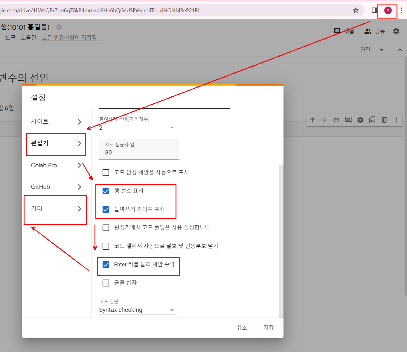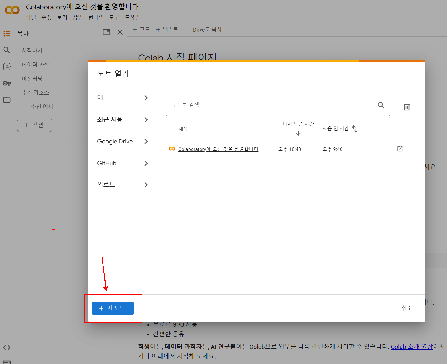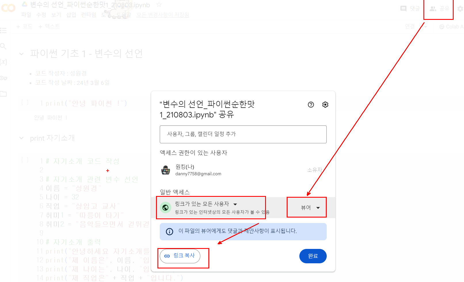 코랩에서 공유 버튼 누르고 링크를 복사한다.