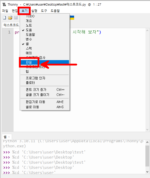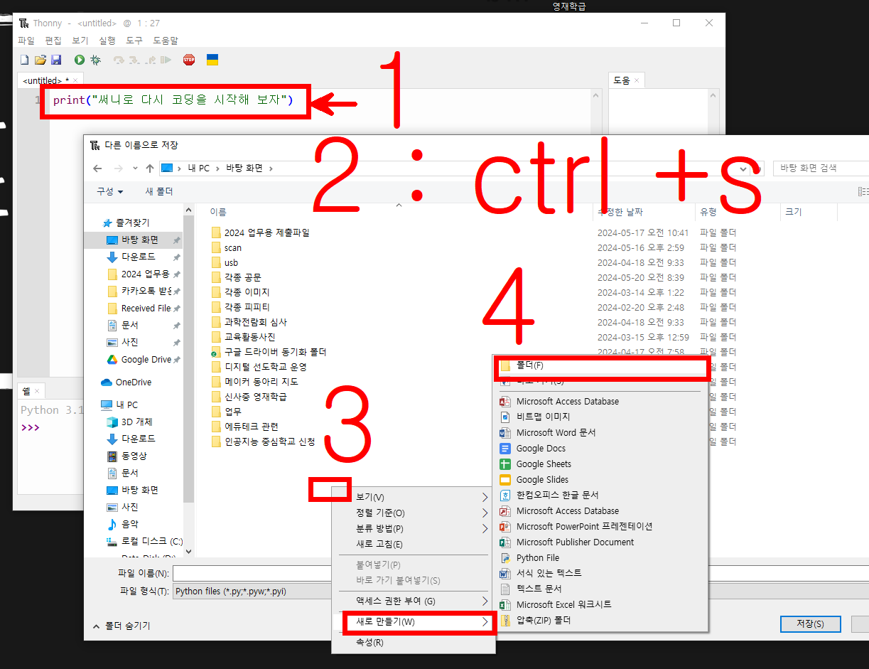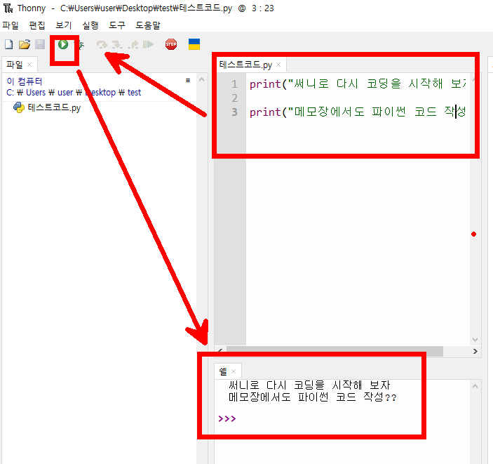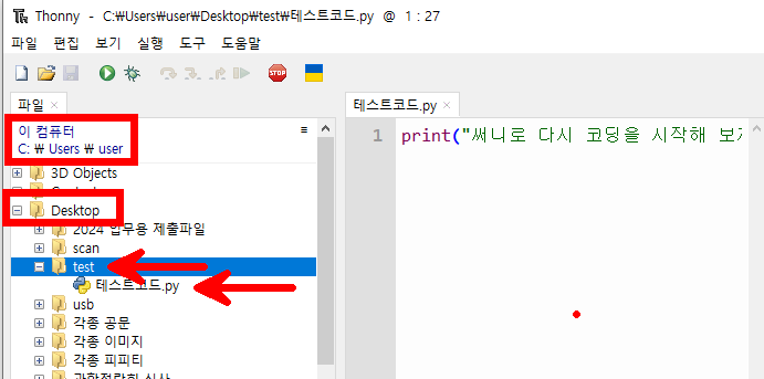 - 바탕화면에 test 라는 폴더 만들고 테스트코드 라고 저장해보자.