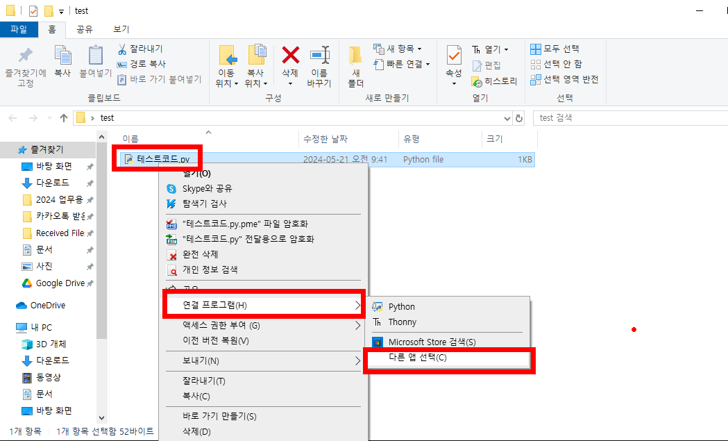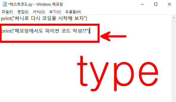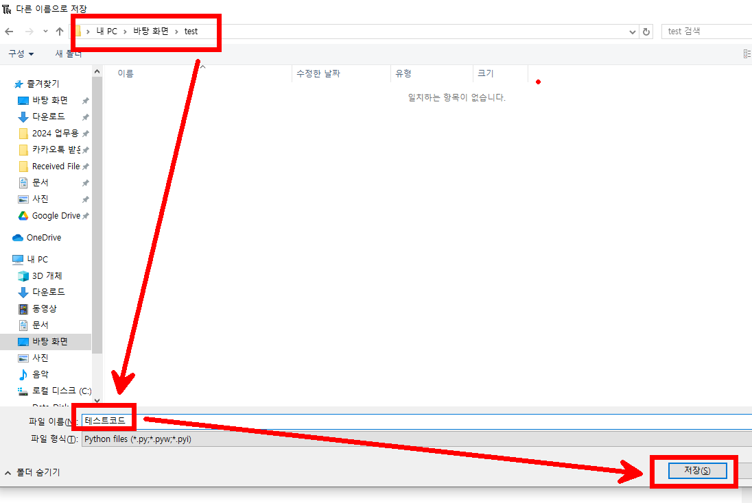 - 바탕화면에 test 라는 폴더 만들고 테스트코드 라고 저장해보자.