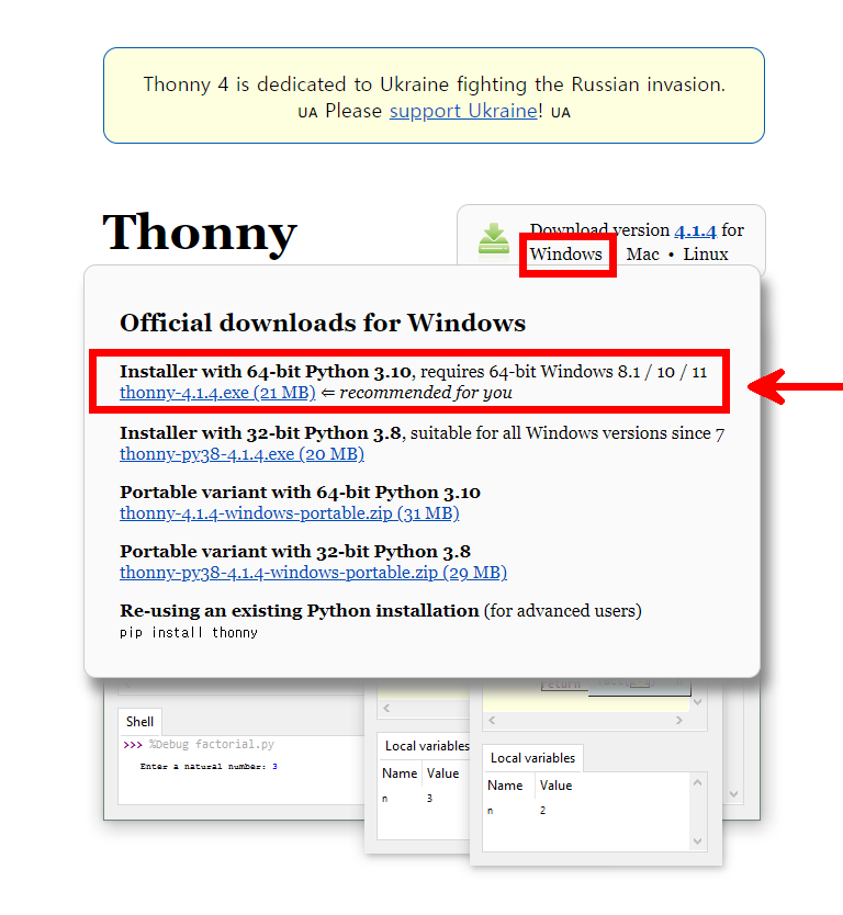 Thonny 4 is dedicated to Ukraine fighting the Russian invasion. 🇺🇦 Please support Ukraine! 🇺🇦 Download version 4.1.4 for • • Thonny Python IDE for beginners Features Easy to get started. Thonny comes with Python 3.10 built in, so ju