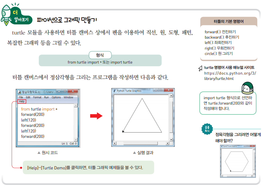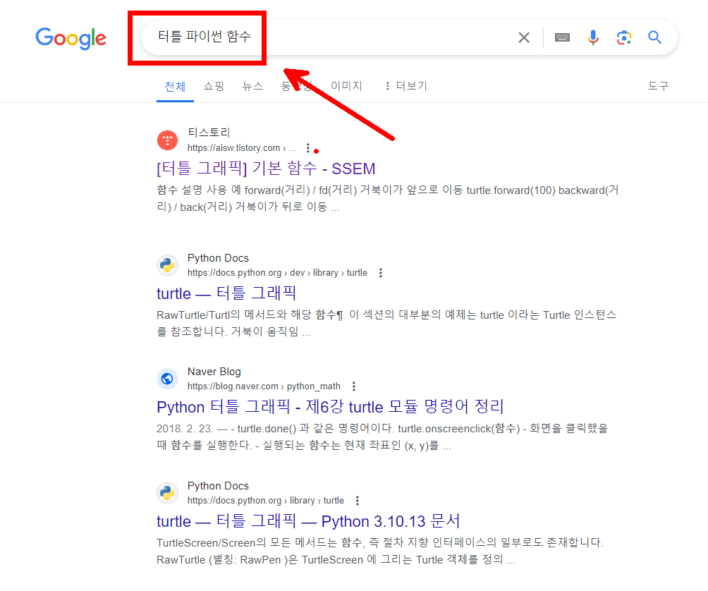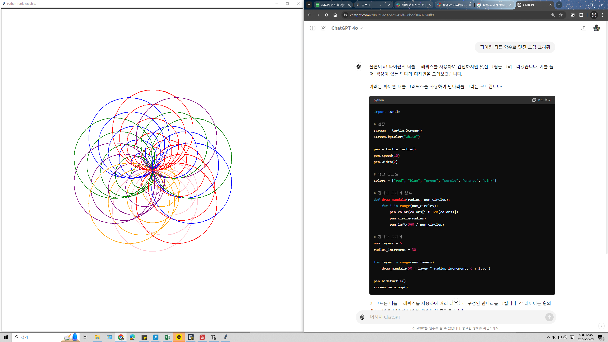 [자유 미션 1] 구글에서 파이썬 터틀 함수를 검색해서 다양한 기능의 함수 명령어를 확인 뒤 나만의 터틀을 그림을 그려보자.