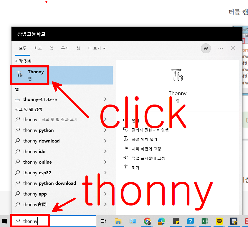 상암고 파이썬 환경 : Thonny : 윈도우 키 누르고 검색