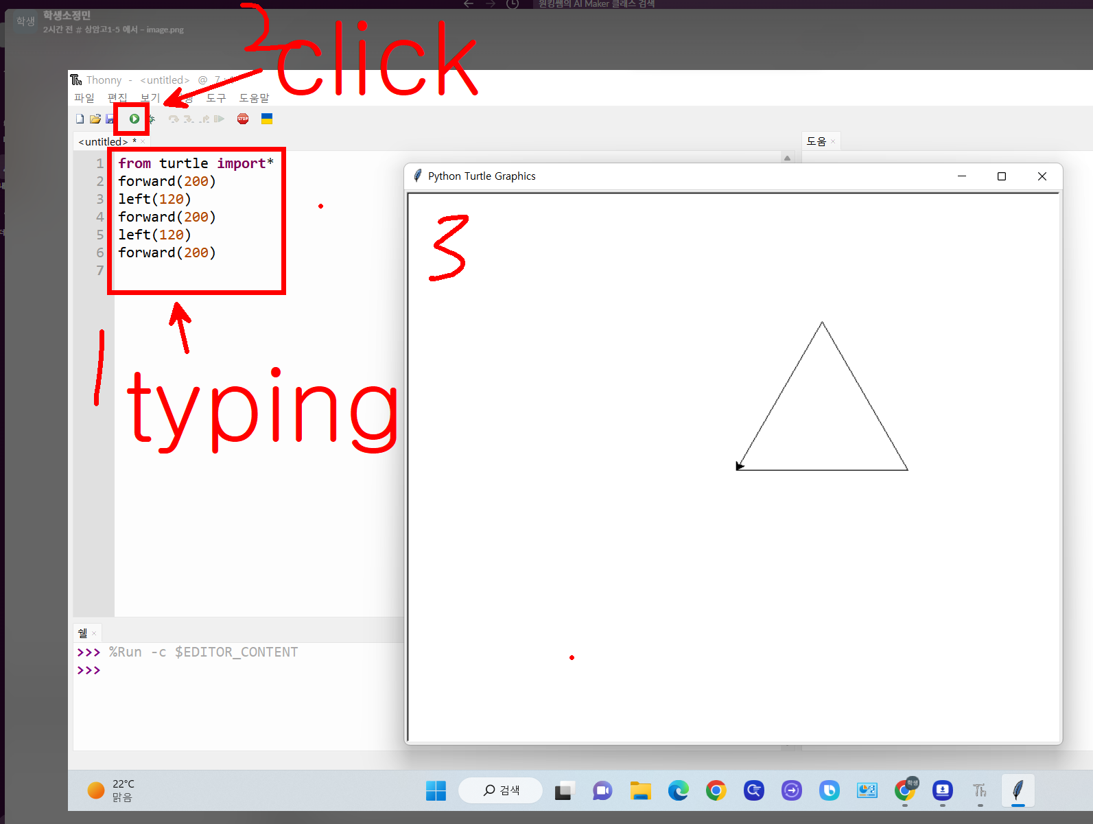 thonny에서 코드 작성 후 코드를 동작 시킨다.