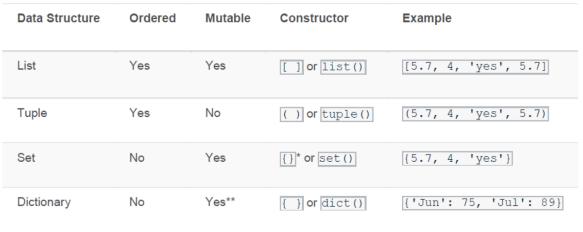 리스트, 튜플, 딕셔너리, 집합의 기본 특성과 형태 -> ordered : 순서, Mutuable : 수정 가능 여부