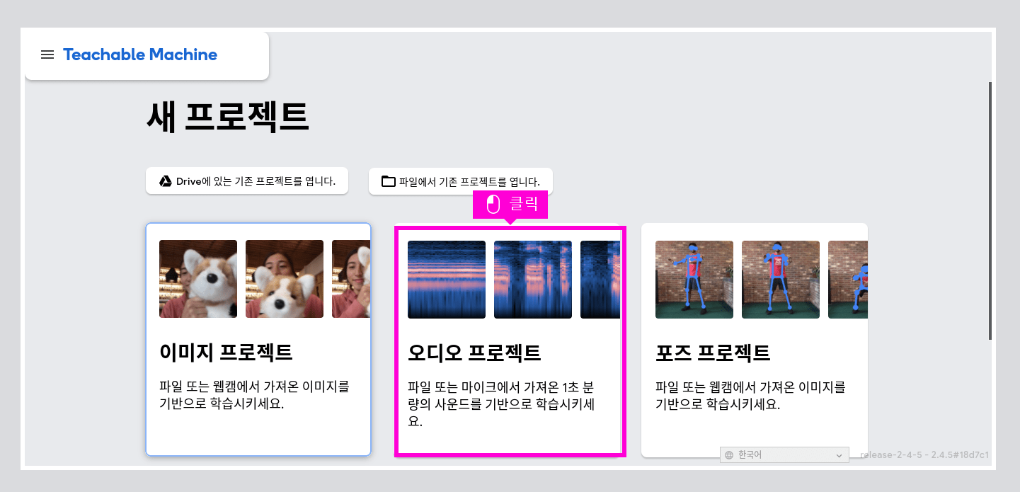 [1. 프로젝트 시작, 녹음] 구글 검색창에서 티처블머신이라고 검색하세요. https://teachablemachine.withgoogle.com/. 시작하기를 클릭합니다.. 오디오 프로젝트를 클릭합니다.. 배경 소음을 녹음하기 위해,