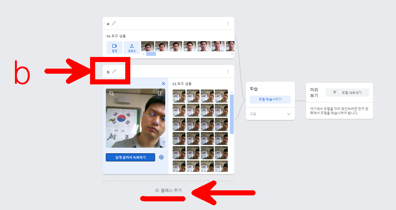 우측 방향 얼굴 학습 시키고 : b , 학습 완료 후 클래스 추가
