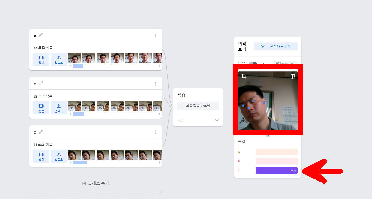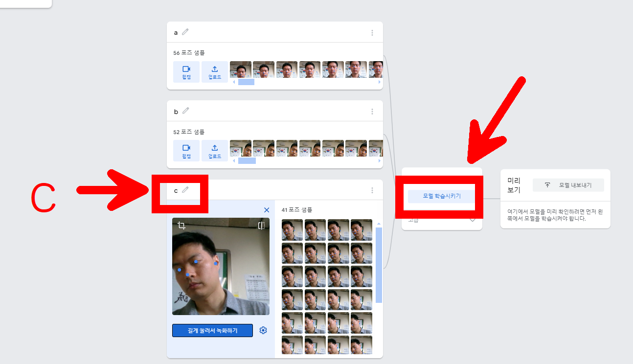 좌측 방향 얼굴 학습 : C, 학습 완료 후 모델 학습시키기