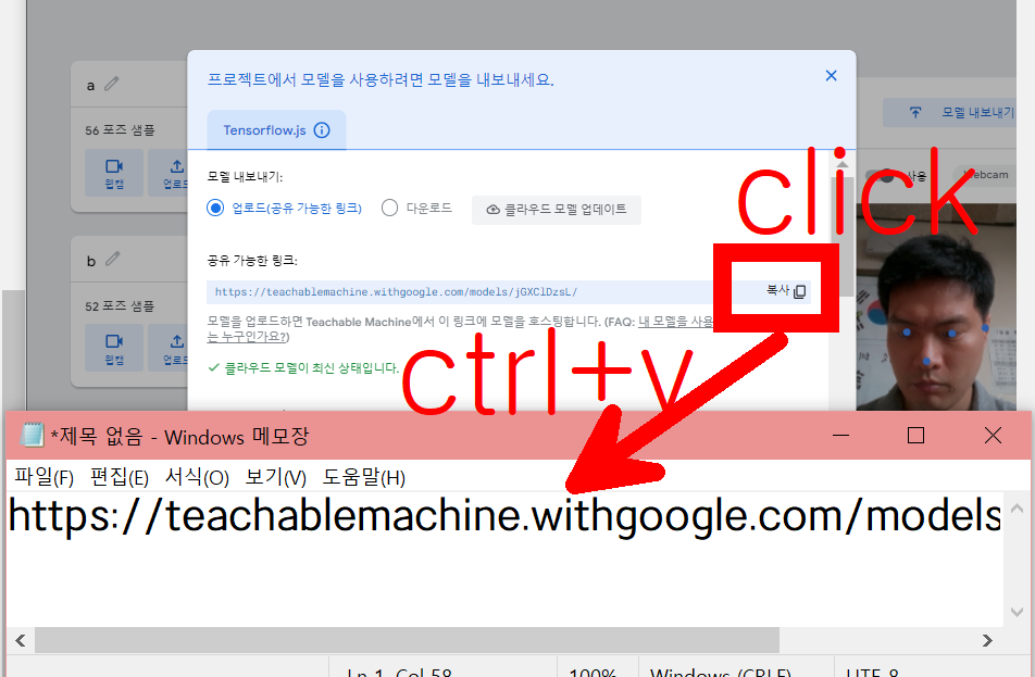 공유 가능한 링크 복사하여 메모장에 기록한다. -> 이것은 방금 학습시킨 AI 모델의 주소이다.