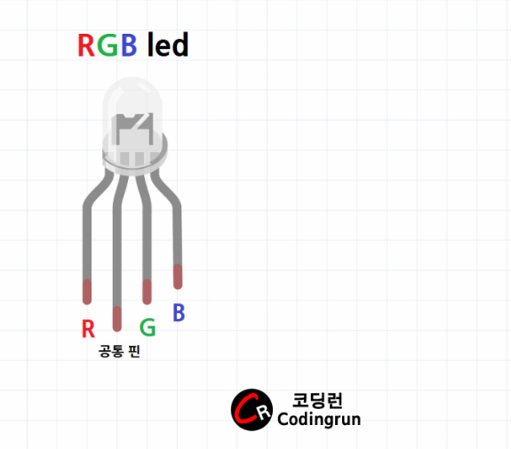 - 아래 그림을 통해 RGB led 핀의 4개지 구성을 알아본다.