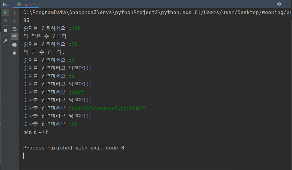 하지만, 숫자가 아닌 값을 입력하면 아래와 같이 오류가 생기며 프로그램이 강제 종료 된다.