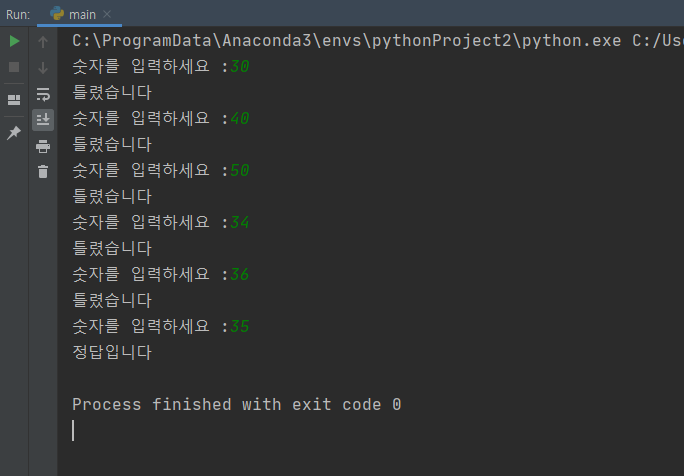 즉 int type의 number는 35의 값이 들어간 반면, str type의 guess는 '35'가 들어가 이 둘은 같지 않은 것이다.
