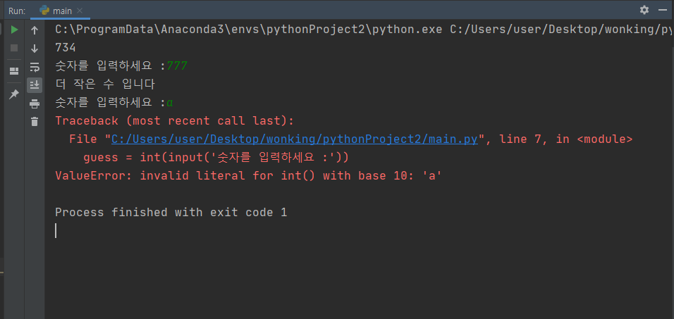 하지만, 숫자가 아닌 값을 입력하면 아래와 같이 오류가 생기며 프로그램이 강제 종료 된다.