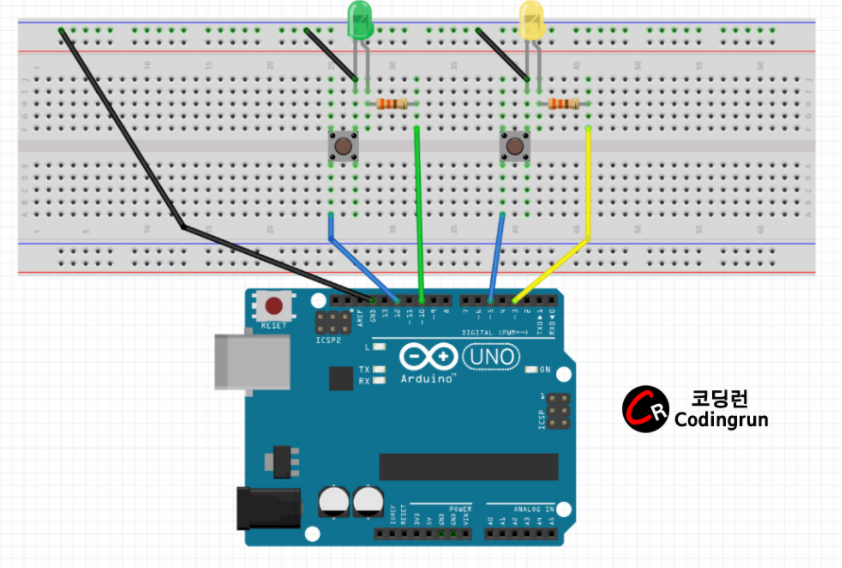 - 아래와 같이 기존 회로에 led 하나를 더 추가하시오.
