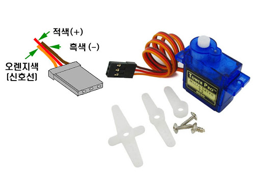 - 서보모터의 3개의 선 중, 적색(+), 갈색(-) 은 각각 VCC와 GND를 공급하여 서보모터에 전력을 공급한다.